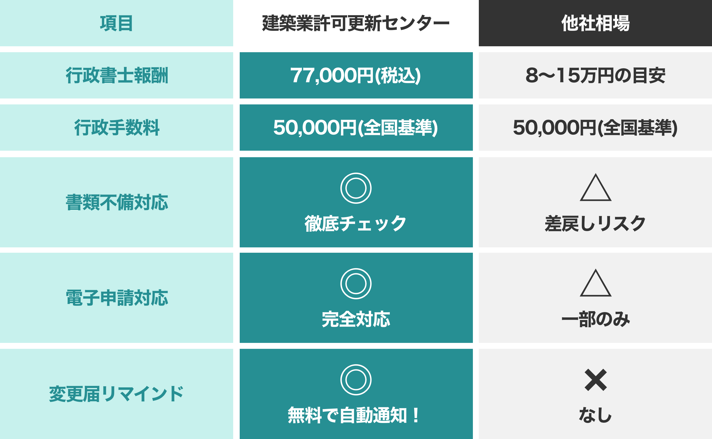 - 行政書士報酬は一律77,000円(税込)です。別途、更新手数料として全国一律50,000円(国交省基準)の実費が必要ですが、追加報酬はありません。