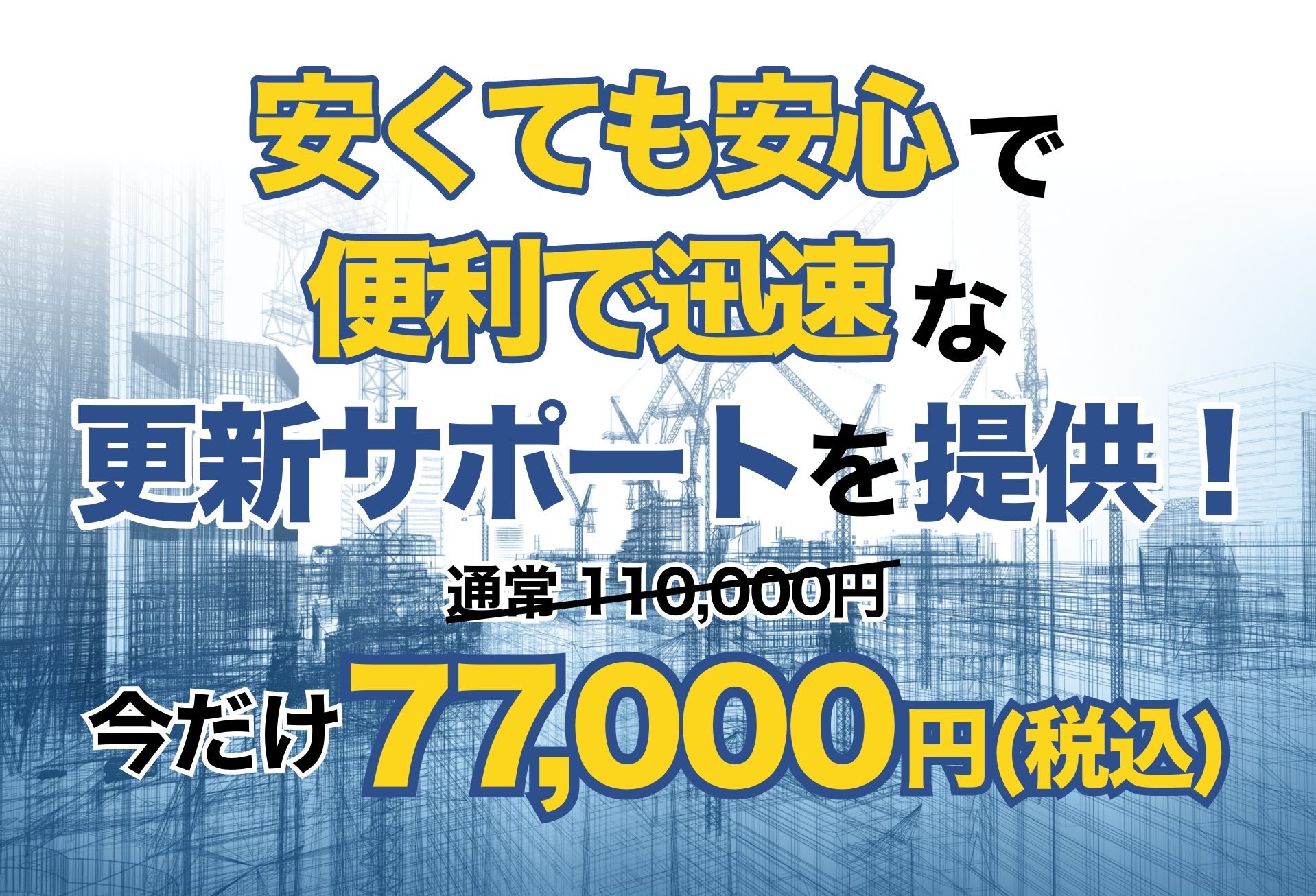 - 行政書士報酬は一律77,000円(税込)です。別途、更新手数料として全国一律50,000円(国交省基準)の実費が必要ですが、追加報酬はありません。